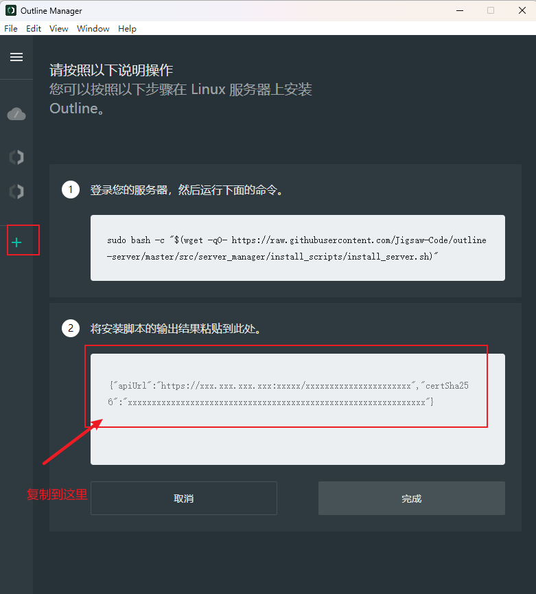 sudo bash -c "$(wget -qO- https://raw.githubusercontent.com/Jigsaw-Code/outline-server/master/src/server_manager/install_scripts/install_server.sh)"